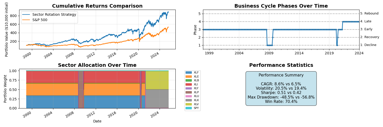 The sector rotation strategy demonstrates a fundamental truth about markets: systematic, disciplined approaches based on sound economic logic can generate meaningful outperformance over time.